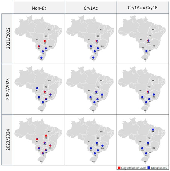 Species composition varied in non-Bt soybean across the years, in contrast to soybeans expressing Bt proteins, which were colonized primarily by R. nu (Figure 3). Although R. nu was, in general, the prevalent species across all seasons, C. includens was the main species in non-Bt soybean in the samples from Goiás and Mato Grosso do Sul in 2021/22, from Goiás in 2022/23, and from Mato Grosso, Tocantins, and Minas Gerais in 2023/24 season.
