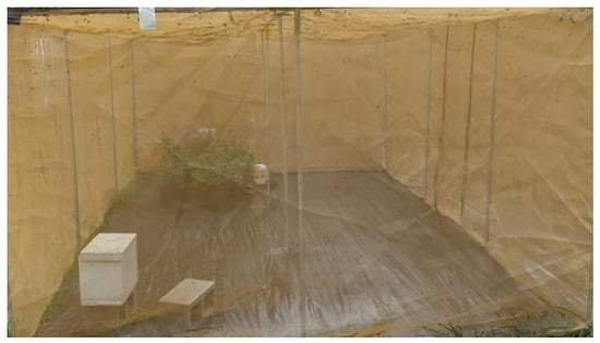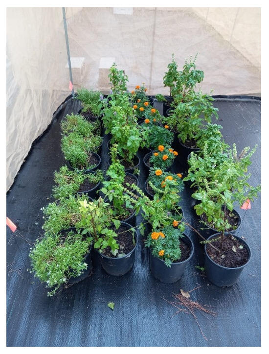 Twenty-one colonies with uniform honeybee (Apis mellifera) populations were established in our apiary at the Research Experimental Farm in Quincy, FL. The experiments were conducted in 15 flight cages (Figure 1) (each 6 m × 3 m × 1.8 m, or 32.4 m2), with 5 flight cages per treatment and 1 nuclear (nuc) colony per flight cage, totaling 15 colonies. The honeybees were provided with three diets (treatments). Treatment 1 (control) received commercial pollen patties (Dadant & Sons, Inc., Hamilton, IL, USA) and sugar syrup. Treatment 2 (monofloral) received anise hyssop (Agastache foeniculum). Treatment 3 (polyfloral) was provided with a companion crop mix [anise hyssop (A. foeniculum), marigold (Calendula officinalis), sweet alyssum (Lobularia maritima) and basil (Ocimum basilicum)]. The companion crops were evenly spaced in the flight cages and covered 10% of the total area to serve as a food source (pollen, nectar) for the bees [26]. A water source was also provided to the bees (Figure 1). The companion plants were chosen because of their high nutritional benefits (nectar and pollen), long blooming period, attractiveness to honeybees, and easiness to grow [27,28,29,30]. Honeybees also select plants to forage based on their colony’s needs [31]. The food sources (companion plants) made up 10% of the total area [26] (Figure 1 and Figure 2). The experiments ran from 4 October to 27 December 2023.