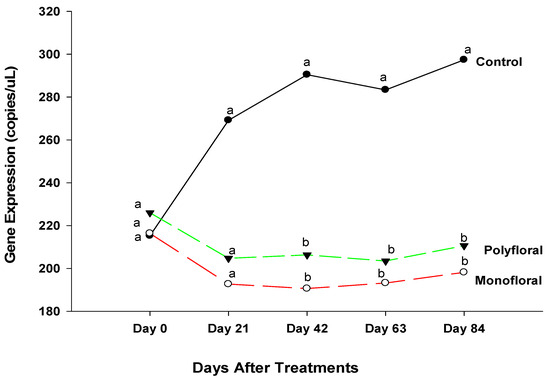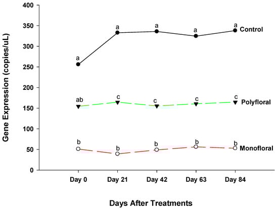 The expression levels of vitellogenin (Vg), a gene associated with immune function and longevity [36], were similar (F = 0.78; df = 2, 3; p = 0.5319) in all treatment groups at the start of the experiments on day 0 (Figure 6). However, differential gene expression levels of adult bees were significantly different between control groups and both monofloral and polyfloral groups on day 21 (F = 14.83; df = 2, 3; p = 0.0048), day 42 (F = 14.83; df = 2, 3; p = 0.0048), and day 63 (F = 8.71; df = 2, 3; p = 0.0503). Expression levels of Vg were similar between adult bees fed with monofloral and polyfloral diets on day 21 (t = 0.76; df = 3; p = 0.5035), day 42 (t = 0.73; df = 3; p = 0.5181), and day 63 (t = 0.56; df = 3; p = 0.6175). At the end of the 84-day experimental period, the gene expression levels of Vg varied significantly between treatments (F = 12.35; df = 2, 3; p = 0.0356) and followed the same pattern as on days 21, 42, and 63, as the expression levels of Vg were similar in adult bees fed with monofloral and polyfloral diets (t = 0.90; df = 3; p = 0.4329). The time effect was significant (F = 2.39; df = 4, 12; p = 0.0510), as were the time-by treatment interactions (F = 3.81; df = 8, 12; p = 0.0188). Adult honeybees in the control groups fed with pollen patties and sugar syrup had significantly reduced Vg gene expression compared to their counterparts fed with monofloral (anise hyssop) and polyfloral diets, and the expression levels of the gene varied during the experimental run.