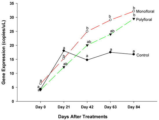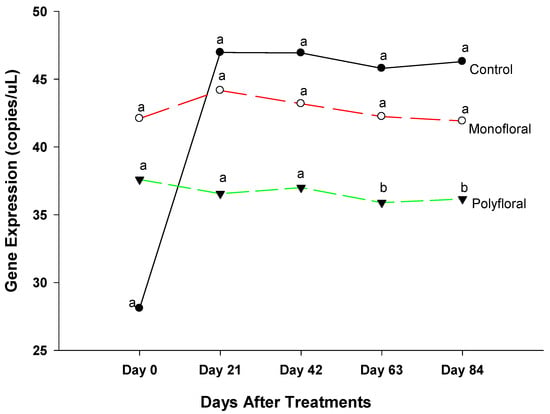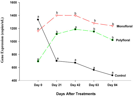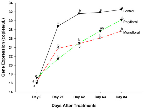 Patterns of the gene expression profile of Vitellogenin in adult bees fed with control (pollen and sugar syrup), monofloral (anise hyssop), and polyfloral (companion crops) diets during the 84-day experimental period. Means between lines within each sampling date are not significantly different if followed by the same lower-case letter (p > 0.05; Tukey test).