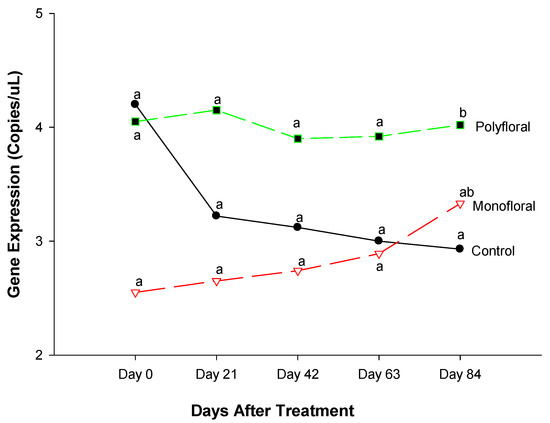 Expression levels (transcript abundances) of Cactus, a gene involved in the immune response in the Toll pathway [40,41] were similar in all treatment groups in flight cages at the start of the experiments on day 0 (F = 0.05; df = 2, 3; p = 0.9476) and on day 21 (F = 0.47; df = 2, 3; p = 0.6658) (Figure 3). However, on day 42, gene expression varied significantly between control groups fed with pollen patties and sugar syrup and their counterparts fed with the monofloral (anise hyssop) and polyfloral (companion crops) diets (F = 9.46; df = 2, 6; p = 0.0140). Gene expression levels of Cactus on day 42 were similar (t = −0.36; df = 3; p = 0.7445) in adult bees fed with monofloral and polyfloral diets. On day 63, differential gene expression levels of adult bees were significantly different between the control groups and both monofloral and polyfloral groups (F = 10.89; df = 2, 9; p = 0.0040) but not between the monofloral and polyfloral diets (t = −0.28; df = 3; p = 0.7958). At the end of the 84-day experimental period, gene expression levels varied significantly between treatments (F = 15.19; df = 2, 12; p = 0.0005). The time effect (a measure of within-treatment variability over time) was not significant (F = 1.79; df = 4,12; p = 0.1949) nor were the time-by-treatment interactions (F = 2.04; df = 8,12; p = 0.1280). However, gene expression levels of Cactus did not differ (t = −0.30; df = 3; p = 0.7832) between the monofloral and polyfloral diets on day 84. Overall, adult honeybees in the control groups fed with pollen patties and sugar syrup upregulated Cactus gene expression compared to their counterparts fed with monofloral (anise hyssop) and polyfloral (companion crops) diets (Figure 1).