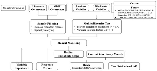 Multicollinearity usually occurs among the predictor variables in ENMs. In addition, reducing the number of variables has been proven to improve the accuracy and transferability of the model and mitigate the risk of overfitting [27,28]. In order to minimize the collinearity and retain valuable variables, a stepwise removal process was adopted by pre-running the model. All variables were incorporated into the pre-run model. (1) Pearson correlation coefficient is commonly used to detect the correlation among variables [29,30]. Correlated variables (|r| ≥ 0.70) with lower contribution in the pre-run model were considered to have poor predictive power and removed from the model. (2) After excluding all variables with significant correlations, further detection of potential multicollinearity was conducted based on the Variance Inflation Factor (VIF). Based on the same principle, variables with VIF ≥ 10 and lower contribution were eliminated until the VIF of the remaining variables were less than 10 [31]. VIF test was performed using the car package in R. The variables finally included in the model are marked as “Yes” in Table 1.