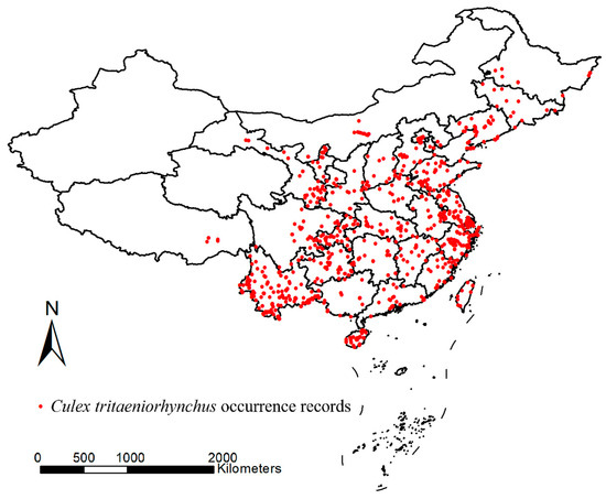 Occurrence data of Cx. tritaeniorhynchus in China were collected from two sources: (1) The literature retrieval. A comprehensive and systematic literature (both in English and Chinese) retrieval was performed on Web of Science, Scopus, ScienceDirect, PubMed and CNKI (Chinese National Knowledge Infrastructure). “Culex tritaeniorhynchus + collection/trap/occurrence/distribution/investigation/monitor/survey” were used as keywords for the retrieval. The time range of the obtained distribution records is from 1957 to the present. The literature containing only detailed information on distribution locations within China will be retained. If the literature contains the detailed coordinates of the mosquito sampling locations, they should be used directly. If the literature does not provide the coordinates but specifies the detailed sampling sites, Google Maps was used to conduct a search and determine the coordinates. A total of 913 occurrence records were obtained from 173 articles. (2) The Global Biodiversity Information Facility (GBIF) database. The GBIF database provides a public platform where occurrence records of any species can be uploaded and are available for open access and use by researchers. From this source, 187 occurrence records with coordinates within China were retrieved from the database. Finally, a database of the distribution of Cx. tritaeniorhynchus in China, consisting of 1100 occurrence records, was established (Figure 2).