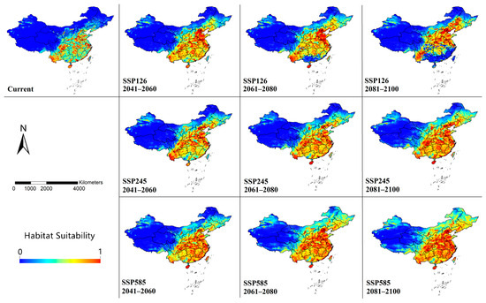 Under different climate change scenarios, the habitat suitability was predicted to change significantly with varying degrees until the end of the 21st century. In the SSP126 model, potential habitats with high suitability were modeled to show a significant trend of shifting northward. In the SSP245 and SSP 585 models, the changes in habitat suitability were similar, but with greater degrees of variation. In the currently low-suitable areas in the northeastern, northern, and western regions, a significant increase in suitability was predicted to occur in all SSPs. Even in the SSP585 model, almost the entire eastern part of China was projected to become suitable for Cx. tritaeniorhynchus by the end of the 21st century.
