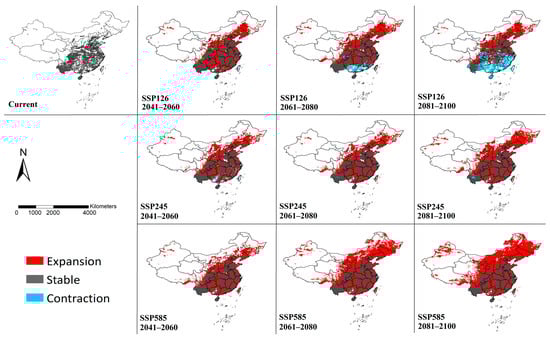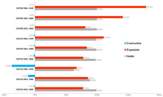 The change in suitable habitat area was calculated based on binary models (Figure 5). In the SSP126 model, with the passage of time, the area of the suitable habitat remaining stable will gradually decrease. Concomitantly, there will be a habitat contraction of up to 37.44% at the end of the 21st century. The most significant expansion was projected to occur in 2061–2080. In the SSP245 and SSP585 models, the vast majority of existing habitats will remain stable, and the expanded area will gradually increase. The most severe climate change scenario (SSP585) yields the highest predicted area of suitable habitats. Only very limited habitat loss was predicted to occur in SSP245 (0.95%~2.10%) and SSP585 (0.09%~0.18%).