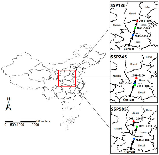 The trend of core distributional shifts was analyzed by calculating the centroids of modeled suitable habitats (Figure 6). In the SSP126 model, the direction of the core distributional shift was expected to remain consistent within the 21st century. The current centroid was located at the border of Hubei and Hunan provinces, in the central-southern region of China. It is predicted that it will continue to shift towards the northeast and reach northern Henan in 2081–2100. Although the shift direction is basically consistent with the SSP126 model, the SSP245 model provides the most conservative estimation. The modeled centroid in 2041–2060 and 2061–2080 are quite close, located at the border of Hubei and Henan provinces. Even by the end of the 21st century, the centroid will only shift to the central part of Henan. The direction and range of centroid shift differs under the SSP585 scenario. The modeled centroids in 2041–2060 and 2061–2080 shift towards the northeast, reaching northern Hubei and central Henan, respectively. However, in 2081–2100, the center is expected to shift northwestward (northward compared to its current position) into southern Shanxi.