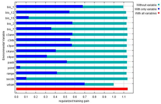 Result of the jackknife test. A longer blue bar or shorter green bar indicates greater relative importance to the model. Descriptions: bio_1: Annual mean temperature; bio_2: Mean diurnal range; bio_7: Temperature annual range; bio_12: Annual precipitation; bio_15: Precipitation seasonality; c3ann: C3 annual crops; c3nfx: C3 nitrogen-fixing crops; c3per: C3 perennial crops; c4ann: C4 annual crops; c4per: C4 perennial crops; pastr: Managed pasture; primf: Forested primary land; range: Rangeland; secdn: Potentially non-forested secondary land; urban: Urban land.