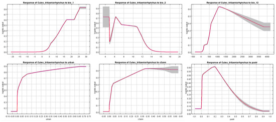 According to the jackknife test, several variables with great importance were identified and their response curves (Figure 8) can reveal the inherent correlations between the distribution of Cx. tritaeniorhynchus and the variables. Bio 1 (Annual mean temperature) reflects its preference towards higher temperatures, which is also the reason why it is currently mainly distributed in the tropical and subtropical regions of China. Higher temperatures can accelerate its development process [56]. With the progression of global warming, the climatic conditions in the high-latitude regions of northern China will gradually become suitable for the survival of Cx. tritaeniorhynchus. The response curve of Bio 2 (Mean diurnal range) indicates that Cx. tritaeniorhynchus has difficulty adapting to large diurnal temperature differences, which is precisely the climatic characteristic of relatively cold low-latitude regions. Moderate to high annual precipitation (Bio 12) can bring about high habitat suitability. Water is necessary for the eggs of Cx. tritaeniorhynchus to maintain activity and hatch [57]. The demand for water in its life cycle was also reflected in the significant impact of croplands on its distribution. Firstly, crops serve as a sugar source for adult mosquitoes, providing essential sustenance for their survival and development [58]. Secondly, agricultural irrigation systems create aquatic environments that are conducive to mosquito oviposition and egg hatching [59]. For example, as the most popular staple in traditional Chinese agriculture, rice, with its extensive paddy fields, offers optimal conditions for mosquito reproduction. Urban land provides mosquitoes with an abundant supply of blood-feeding hosts (humans) as well as sufficient water sources and living shelters. Managed pastures with plants, livestock, and human residents also provide suitable conditions for the survival of mosquitoes. It should be noted that, apart from humans, pigs also serve as important blood-feeding hosts for Cx. tritaeniorhynchus [60]. With the development of the concepts of animal welfare and ecological farming [61], the breeding patterns of pasture pigs may pose a higher risk of vector-borne diseases in the future. Many variables among bioclimatic variables were excluded, while most land use variables were retained due to the absence of multicollinearity risk. This does not mean that certain variables that have been excluded have no impact on the distribution of mosquitoes. Instead, it is because the retained variables were considered to contain the vast majority of information from the excluded variables, and their contribution to the model has been proven to be greater in the pre-run.