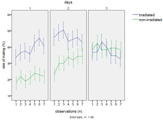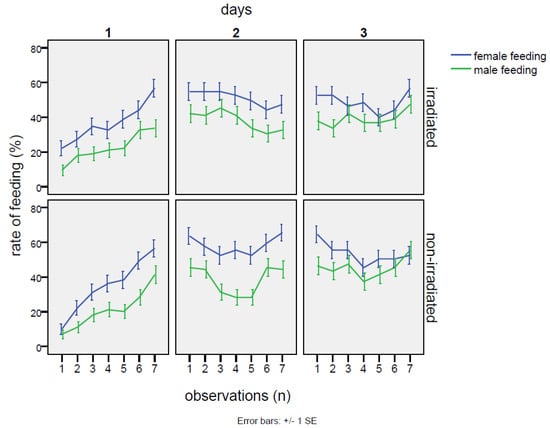 No detrimental effects on mating were observed in the group with irradiated males. The percentages of cases with any mating in the cage throughout the whole experiment were totally equivalent between the irradiated and non-irradiated male groups (25% of cases without mating events in the cages with irradiated males and 26% of cases within the cages with non-irradiated males). On the contrary, the irradiated males at the dose of 80 Gy were able to mate with the females as well as or even better than the non-irradiated individuals. In fact (Table 2), excluding the cages with zero mating, females mated with irradiated males for 40.1 ± 1.1% of the time, in comparison to 30.5 ± 1.1% of the time when the normal males were confined with females. This gap was statistically significant (Table 3), according to the GiLM GEE model (effect of the irradiated in comparison to the non-irradiated: Wald = 10.12 p = 0.00146). Observing the trend in mating rate, the mating with the irradiated male started at much higher levels than in the cross with the non-irradiated (38.5 ± 1.9% vs. 21.5 ± 1.5%; contrasts: Z = 3.18, p = 0.0015), continuing to increase on the second day (day 1–day 2 contrasts: Z = 2.26, p = 0.0236) and remaining significantly higher than in the cross with the non-irradiated male (47.5 ± 1.9% vs. 31.1 ± 1.8% of the non-irradiated; contrasts: Z = 2.18, p = 0.0083). However, mating activity decreased on the third day (day 2–day 3 contrasts: Z = 3.48, p ≤ 0.001), with values similar to the non-irradiated group (37.0 ± 1.9% vs. the 39.2 ± 1.9% of mating rate recorded on non-irradiated males). In the case of mating with the non-irradiated males, on the first day, mating occurrence started at low levels (21.5 ± 1.5%) and then showed a positive trend until the end of the experiment (interaction non-irradiated*day 3: Wald = 11.26, p = 0.00079). Thus, the irradiation treatment increased mating chances until the second day of the experiment, then becoming almost equivalent to the cross with the non-irradiated on the last day (Figure 1, Table 2). As regards feeding behavior, no significant effects of irradiation were detected, neither when comparing irradiated males to females, nor when comparing irradiated males among themselves (Table A3). The only robust effect was the higher occurrence of female feeding in comparison to males (intercept: Wald = 22.24, p = 2.4 × 10−6), regardless of irradiation treatment (Table 2), although on the third day, the gap between males and females significantly decreased (day 3: coef. = −0.0466, Wald = 5.05, p = 0.025). Instead, a common feature was shared with the two males and the females: a sinusoidal trend emerged after a steady increase in feeding activity on the first day (Figure 2). This trend was verified by a GiLM GEE model applying a non-linear cubic trend (Appendix A, Table 1 and Table 2, and Figure A4).