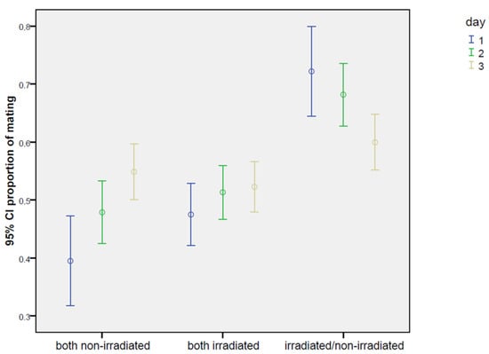 The second experiment confirmed and extended these findings by examining the competitiveness of males irradiated at 80 Gy in no-choice and choice tests over three days of observation (Figure 5).