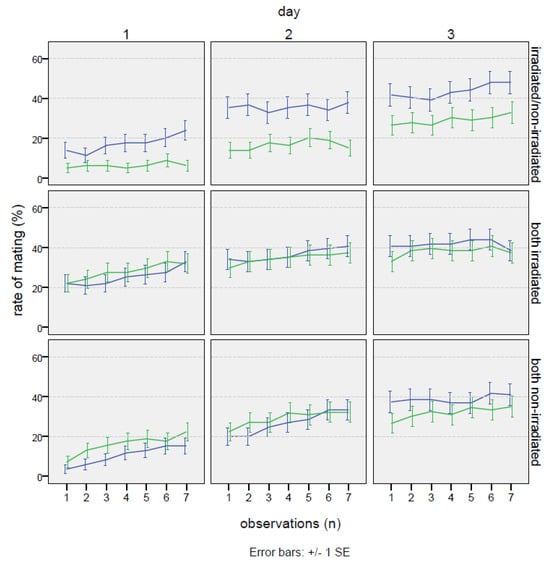 No-choice test: mating trends measured as the percentage of time spent in mating during the three days of the experiment in the two crosses with the irradiated male and the non-irradiated male of Bagrada hilaris. The blue line represents the irradiated male, and the green line the unirradiated male.