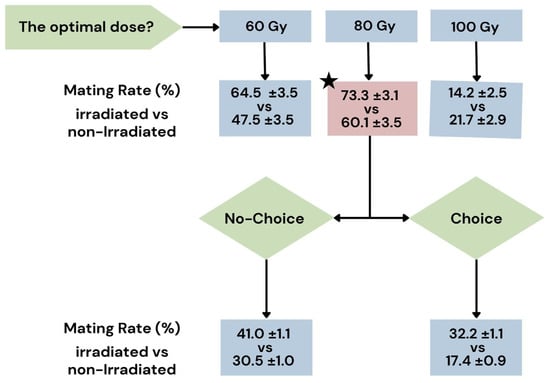 Flow chart illustrating the results of the two experiments. In the first experiment, the optimal irradiation dose was determined by testing 60, 80, and 100 Gy, revealing that an 80 Gy dose produced the highest mating rate in Bagrada hilaris. Subsequently, tests were conducted under choice (one non-irradiated female, one irradiated male, and one non-irradiated male) and no-choice (one non-irradiated female and one irradiated male) conditions. The black pentagram indicates the dose considered optimal, which is 80 Gy.