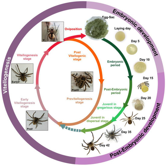This review compiles the available information to date on a topic of great importance for arachnids as well as any oviparous animal: reproduction. In recent years, significant efforts have been made to understand the morphological and physiological changes in spider eggs using specialized high-resolution techniques such as X-ray microtomography, SEM equipped with software for 4D recording, fluorescent dyes, single-cell sequencing, and SPLiTseq scRNA-seq [22,169,204,255]. However, information regarding the biochemistry and energy metabolism of reproduction in general, and specifically the biochemistry of vitellogenesis and embryogenesis, remains limited.