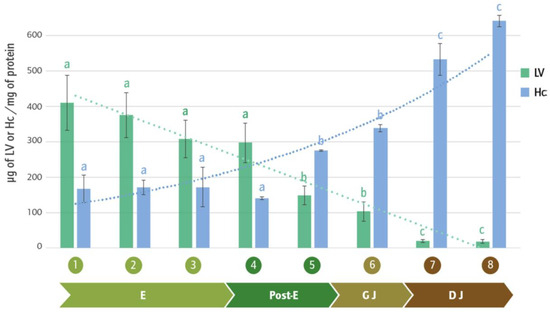 The term lipovitellin (LV) often refers to the Vg endocytosed by the ovary; therefore, it is common for them to share apolipoproteins, immunological identity, and amino acid sequences [42,43,44]. In some arthropods, it has been determined that Vg undergoes modifications in the ovary to form LV, which is later found in eggs, while in others, this modification continues until the formation of the so-called vitellins (Vn) [45,46,47].