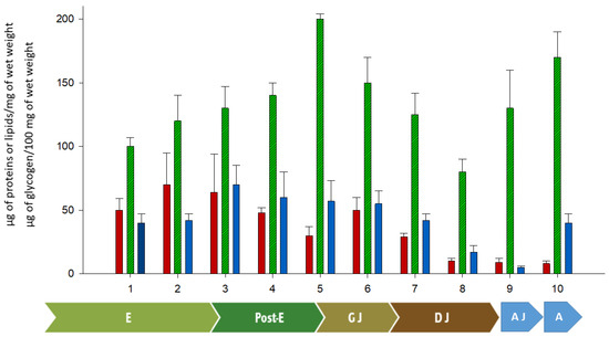 Quantitative analysis of lipids (red), proteins (green) and glycogen (blue) present in the development of P. pythagoricus. Values are the means ± SDs. 1 to 8: stages of P. pythagoricus development; E: embryonic period; Post-E: post-embryonic period; GJ: juveniles in gregarious stage; DJ: juveniles in dispersal stages, AJ: advanced juvenile stage, A: adult stage.