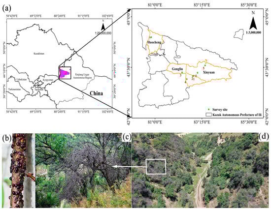 Locations of survey sites and damage status of wild apricot forests infested by Sphaerolecanium prunastri in Gongliu, Xinyuan, and Huocheng Counties, Xinjiang Uyghur Autonomous Region, China. (a) The dots in the map on the right indicate the 7 survey sites in the Yili River Valley: 1: Kuolesai; 2: Jinqikesai; 3: Keersenbulake; 4: Xiaomohuer; 5: Tuergen; 6: Talede; 7: Xiaoxigou. (b) The female scale insects adhere to the surface of the branches. (c) Desiccated and dead wild apricot branches resulting from infestation. (d) Regional damage status of wild apricot forests. Tree crowns that appear gray (arrow) have suffered severe damage.