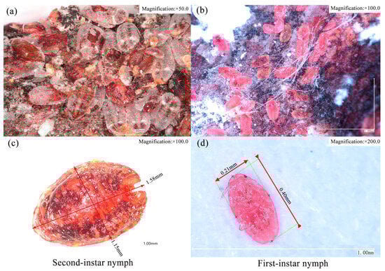 Morphological characteristics of first- and second-instar nymphs. (a) The morphology of 2nd-instar nymphs at 50× magnification; (b) The morphology of 1st-instar nymphs at 100× magnification; (c) The morphological size of a 2nd-instar nymph at 100× magnification; (d) The morphological size of a 1st-instar nymph at 200× magnification.