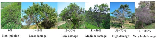 To assess the damage due to GS infestation, we surveyed the damage rankings of trees and the number of dead individuals. Tree damage was categorized as: 0 = non-infested, 1 = least damaged (1–10%), 2 = low damage (11–30%), 3 = medium (31–50%), 4 = high (51–70%) and 5 = very high (71–100%) damage based on the percentage of branches damaged by GS in each tree (Figure 3). This monitoring was conducted in early to mid-June between 2021 and 2024 by PZ for consistency. We assessed the mortality of wild apricots in each plot to evaluate the cumulative effect of GS on tree health in 2021 and 2024. The dead individuals were identified based on the presence of old GS damage and the absence of new branches and green leaves.