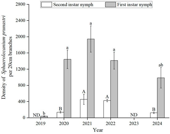 The density dynamics of 1st- and 2nd-instar nymphs from 2019 to 2024 in wild apricot forests (no data in 2023). Capital letters represent a difference between 2nd-instar nymphs among years; lowercase letters represent a difference between 1st-instar nymphs among years. ND: no data.