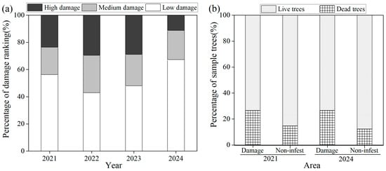 There were significant differences in damage among years (Figure 6a). Between 2021 and 2023, while high and medium damage rankings increased to 29.6% and 27.6%, respectively, the high damage ranking decreased to 11.2% in 2024. Correspondingly, the low damage ranking increased from 56.2% to 67.3%, which indicated that the damage of wild apricot trees was gradually declining. However, the mortality of wild apricots in damaged areas was higher than that in non-infested areas. In 2021 and 2024, the percentages of dead trees in damaged areas reached 27.6% and 26.7%, while 13.0% and 12.4% dead trees occurred in non-infested areas in these years, respectively (Figure 6b).