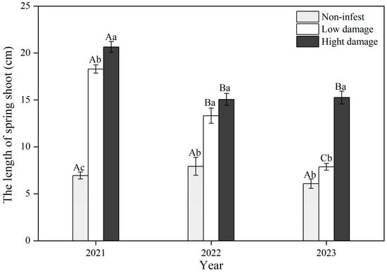 The lengths of spring shoots among three damage rankings. Capital letters represent a difference between years; lowercase letters represent a difference in the spring shoot length between the three damage rankings.