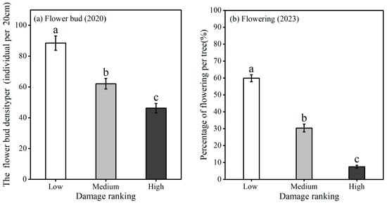 GS negatively affected the reproductive capacity, affecting both flower buds and flower abundance per tree. The densities of flower buds and flowering percentages per tree were different among the three damage rankings (flower bud: F(2,478) = 31.83, p < 0.001; flowering percentage per tree: F(2,429) = 331.59, p < 0.001). With increasing damage, the flower bud density and flowering percentage per tree decreased. The flower bud density of low-damage trees (88.5 ± 4.7 per tree) was about 2 times higher than that of high-damage trees (46.2 ± 3.1) (Figure 8a). The flowering percentage of low-damage trees (59.8 ± 2.0 per tree) was more than 8 times higher than that of high-damage trees (7.5 ± 0.9 per tree) (Figure 8b).