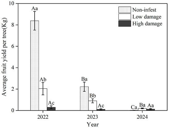 The fruit yield of wild apricots among three damage rankings. Capital letters represent a difference in fruit yield between years; lowercase letters represent a difference in fruit yield between the three damage rankings.