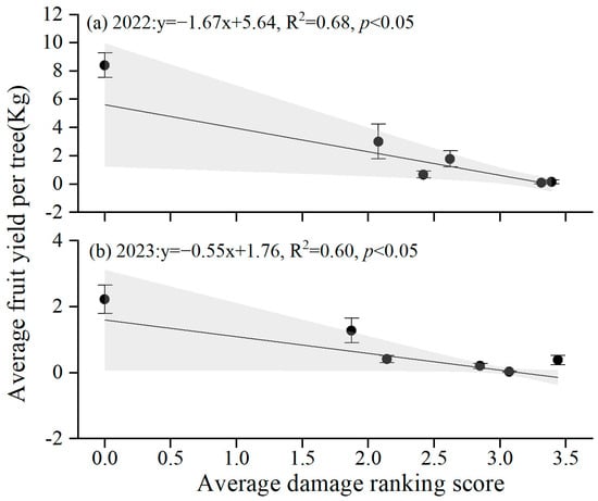 Average fruit yield per survey site relative to damage ranking score of wild apricots in 2022 (a) and 2023 (b). The line shows the linear regression.