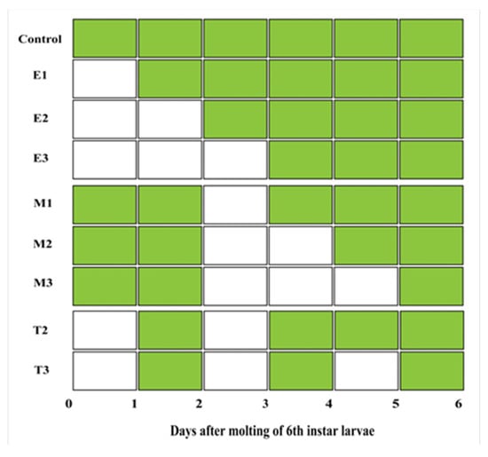 The schedule of feeding (green) and starvation (white) for 6th instar larvae of H. cunea. (E1, 2, 3: the 6th instar larvae were starved for 1, 2, and 3 days after molting, and then were fed fresh mulberry leaves ad libitum until pupation. M1, 2, 3: the 6th instar larvae were fed fresh mulberry leaves ad libitum for 2 days after molting, and then they were starved for 1, 2, and 3 days, respectively. Afterwards, the larvae were continuously fed fresh mulberry leaves ad libitum until pupation. T2, 3: the 6th instar larvae were starved for 1 day after molting and refed 1 day. This was repeated two and three times, respectively.