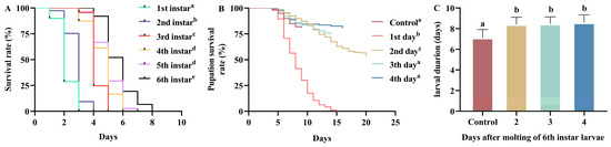 Effect of starvation on the survival and development duration of H. cunea larval. (A) Survival curves of larvae of different H. cunea larval instar stages. (B) Pupation survival curves of 6th instar H. cunea larvae at different days of molting, under complete food deprivation. Each curve was discontinued once all the larvae in the treatment group had pupated. (C) Development duration of 6th instar larvae H. cunea larvae at different days. Different letters indicates a significant difference among treatment groups.