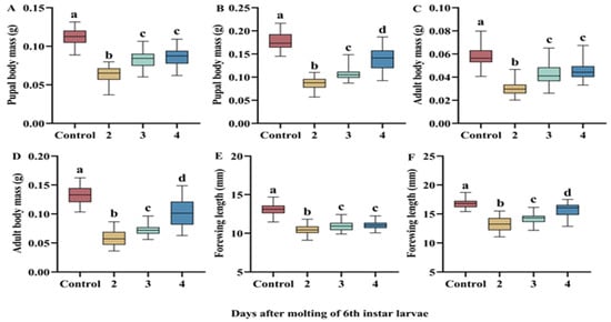 The effect of complete food deprivation on the body size of pupal and adult H. cunea. Pupal body mass of male (A) and female (B). Adult body mass of male (C) and female (D). Adult forewing length of male (E) and female (F). Data are shown as means ± SE. The top and bottom of each boxplot represent the upper and lower quartiles, respectively; the horizontal line within the box represents the mean; the whiskers extend to the minimum and maximum values within 1.5 × the interquartile range. Different letters indicate statistically significant differences among groups.