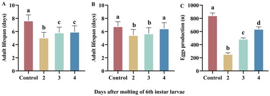 To clarify the effects of starvation stress on larval life history and adult fitness, developmental duration and survival rates were measured during the larval stage, pupal body mass was measured during the pupal stage, and adult body mass, longevity, female fecundity, forewing length, and thorax/abdomen ratio were measured during the adult stage. After larvae were subjected to starvation treatments, larval survival and developmental duration were recorded daily. The larvae were considered alive if they moved after being touched on the thorax with a fine bristle brush, and they were considered dead if they did not move. On the 2nd day after pupation, the sex of each larva was identified based on the positions of the 8th and 9th instar germinal pores of the pupa [30]. Each pupa was weighed using an electronic balance (AL104 Mettler-Toledo; Mettler-Toledo Zurich, Switzerland, d = 0.0001 g) and placed in a cage containing egg-laying paper. Adults were weighed on the day they fledged, and the numbers of eggs laid were counted under a microscope. The lifespans of adults were recorded after death, and forewing lengths were measured using a micrometer (0.1 cm). In addition, on the day of adult emergence, the female and male adults were placed in centrifuge tubes, frozen in liquid nitrogen, and stored at −80 °C. Later, they were placed in a drying oven at 70 °C for 24 h. The thorax and abdomen of each adult were separated using a dissecting knife under a microscope, and the dry weights were determined using an electronic analytical balance to calculate their thorax/abdomen ratio.