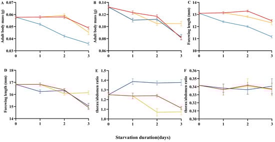Complete food deprivation in the larval stage had significant effects on pupal body mass (male, F3,309 = 316.67, p < 0.001; Figure 3A; female, F3,151 = 225.05, p < 0.001; Figure 3B), adult body mass (male, F3,298 = 227.38; p < 0.001; Figure 3C; female, F3,141 = 219.59, p < 0.001; Figure 3D), and forewing length (male, F3,282 = 247.51, p < 0.001; Figure 3E; female, F3,138 = 103.55, p < 0.001; Figure 3F). Starvation stress in the larval stage reduced pupal body mass, but with a delay in the beginning of the starvation treatment, pupal body mass tended to increase significantly. The trends of adult body mass and forewing length were consistent with that of pupal body mass.