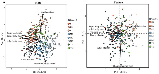 PCA of the life history parameters of H. cunea under different refeeding modes after starvation. (A) Male; (B) Female. Abbreviations are provided in Figure 1.