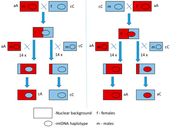 Since mitochondria and their genomes exhibit exclusively maternal inheritance, females with a specific mitochondrial haplotype were mated with males of the desired nuclear background. By crossing females from the selected experimental lines for a minimum of 14 consecutive generations with males from the same IFL, the mitochondrial haplotype of the female was retained, while its nuclear background was gradually replaced with that of the IFL of the male over 14 generations. After this procedure, the proportion of the original nuclear genome of the female’s line would be approximately 0.006%, with each subsequent backcrossing generation further decreasing the proportion of the female’s original nuclear genome. The design of the backcrossing used to construct the experimental MNILs is shown in Figure 1. Through backcrossing, four mito-nuclear lines were created for each pair of IFLs, with all combinations of nuclear backgrounds and mitochondrial haplotypes (quartet). In this way, a total of 44 experimental MNILs (11 quartets) were obtained, whose fitness was compared through a series of experiments. After 14 generations of backcrossing, these MNILs were re-tested with RFLP analysis using HaeIII restriction enzyme to exclude the possibility of working with lines of the wrong genotype before the fitness component experiments.