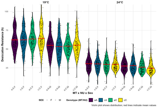 Violin plots showing the distribution of desiccation resistance for all combinations of genotypes and sex across all 11 quartets combined on two experimental temperatures. Individual data points are overlaid as jittered dots, with shapes distinguishing between sexes. The mean resistance time for each group is indicated with a red horizontal line. Colors indicate genotype combinations. The lowercase letter represents the mtDNA haplotype (MT), where “a” corresponds to haplotype I, while “c” corresponds to haplotype II. The uppercase letters represent the corresponding nuclear background (NU), while F and M denote females and males (sex), respectively.