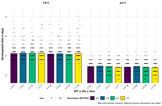 The mean developmental times of D. subobscura in days for all genotype and sex combinations across all 11 quartets combined at two experimental temperatures. Individual data points are overlaid as jittered dots, with shapes distinguishing between sexes. The lowercase letters represent the mtDNA haplotype (MT), where “a” corresponds to haplotype I, while “c” corresponds to haplotype II. The uppercase letters represent the corresponding nuclear background (NU), while F and M denote females and males (sex), respectively.