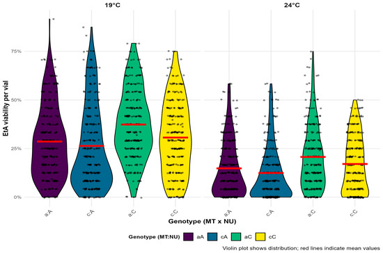 Violin plots showing the distribution of viability per vial EtA survival) for all genotype combinations across all 11 quartets combined on two experimental temperatures. Individual data points are overlaid as jittered dots. The mean viability for each group is indicated with a red horizontal line. Colors indicate genotype combinations. The lowercase letter represents the mtDNA haplotype (MT), where “a” corresponds to haplotype I, while “c” corresponds to haplotype II. The uppercase letters represent the corresponding nuclear background (NU).