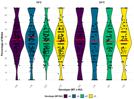 Violin plots showing the distribution of the percentage of males per vial for all genotype combinations across the whole dataset on two experimental temperatures. Individual data points are overlaid as jittered dots. The mean percentage of males for each group is indicated with a red horizontal line. Colors indicate genotype combinations. The lowercase letter represents the mtDNA haplotype (MT), where “a” corresponds to haplotype I, while “c” corresponds to haplotype II. The uppercase letters represent the corresponding nuclear background (NU).