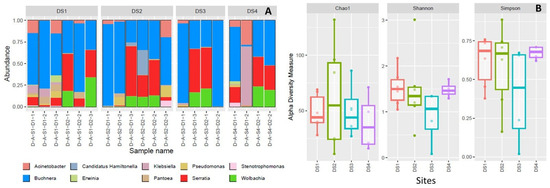 The community composition of the most frequent bacterial symbionts for each aphid colony inside the sites (A) and alpha diversity analyses by sites (B).