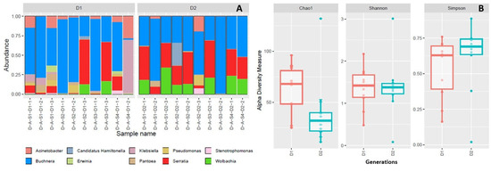 The community composition of the most frequent bacterial symbionts for each aphid colony between generations (A) and alpha diversity analyses by generations (B).
