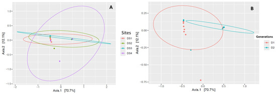 Principal component analyses (PCoA) by sites (A) and generations (B), where locations (sites) and generations were considered as the main components and endosymbiont species diversity as variables.