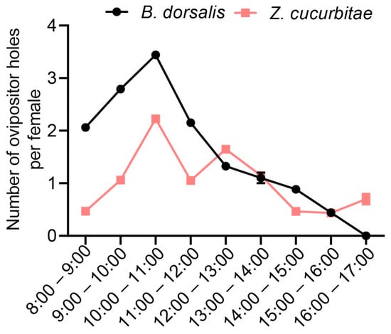 3.1. The Optimal Egg-Laying Time for B. dorsalis and Z. cucurbitae