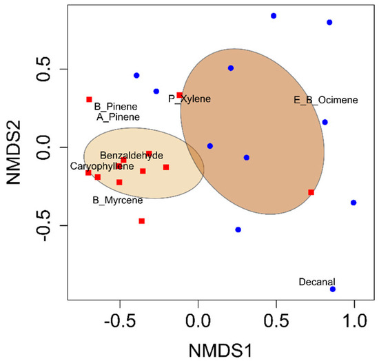 28]. Non-metric multidimensional scaling (NMDS) was conducted using the vegan package in R Studio to visualize variations in VOC blends [