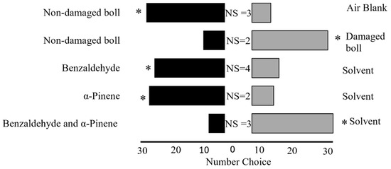 In the current study, several potential explanations could account for the observed repulsion of leaffooted bugs in relation to the combination of benzaldehyde and α-pinene. The attractiveness of benzaldehyde and α-pinene individually may have been strongly influenced by their concentrations, as changes in their concentrations within a blend can result in different, or even opposing, behavioral responses. Additionally, it is possible that the concentration ratios used in the synthetic blend did not accurately reflect the natural ratios emitted by damaged bolls, potentially causing a shift from attraction to repellence. Moreover, the combination of benzaldehyde and α-pinene may mask certain cues that leaffooted bugs rely on for host location. When the blend is highly concentrated or differs from its natural ratio, it may no longer be recognized as a favorable cue, potentially resulting in avoidance behavior. Other studies have suggested that intercropped plants can mask or disrupt the olfactory cues herbivores rely on to locate their host plants, thereby reducing herbivore attraction and feeding [