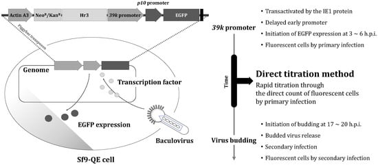 Therefore, in this study, we aimed to develop a new titration method, the direct titration method, with a dramatically reduced time required to determine titers using the Sf9-QE cell line (Figure 1). In the plaque assay, the virus is directly titrated by the number of plaques formed after serial dilution and the inoculation of the virus to be titrated [5]. Using the same principle, our hypothesis was that virus titer determination would be possible if the number of virus-infected cells could be directly counted after serial dilutions of the virus to be titrated; however, unlike the plaque assay, reliable virus titer determination was expected to be possible only if the phenotype identified with EGFP during the primary infection in Sf9-QE cells could be confirmed before the phenotype after the secondary infection of the virus. The observation of EGFP expression in the Sf9-QE cells as early as one day post-infection (d.p.i.) showed the feasibility of such virus titer determination [12]. It has been reported that the budding of baculoviruses occurs from about 17 to 20 h after primary virus infection, with the infection of other cells and the expression of the phenotype occurring after additional time [13]. The rapid and robust expression of the phenotype is required to confirm the phenotype of the primary infection of the virus prior to the expression of the phenotype of the cells after the secondary infection. In the case of Sf9-QE, the early expression of EGFP has already been demonstrated as early as one day after viral infection by the 39k promoter, a delayed-early promoter that is activated by the immediately early 1 (IE–1) protein and operates from 3 to 6 h after infection [14,15]. Additionally, although the rapid expression of EGFP at 1 d.p.i. was confirmed, it was believed that the copy number of the transgene present in the transfected cell line would have a major influence on the quantitative expression; therefore, the determination of the copy number of the EGFP transgene in the Sf9-QE cells would further confirm the feasibility of developing a rapid titration method using Sf9-QE cells.