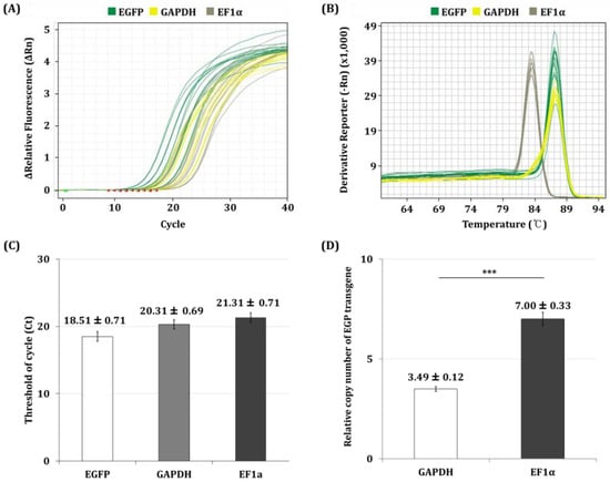As a result, the reliability of the qPCR was confirmed by amplification-curve and melting-curve analysis (Figure 2A,B). The cycle threshold (Ct) values of the EGFP, GAPDH, and EF1α genes were found to be 18.51 ± 0.91, 20.31 ± 0.89, and 21.31 ± 0.92, respectively (Figure 2C). The copy number ratio of the transgene was calculated using the ΔCt method, where ΔCt is defined as the difference between the Ct values of the transgene and the reference gene. The copy number ratio of the EGFP gene to each reference gene was calculated using the following equation [17]: