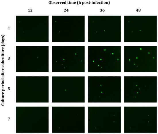 Before determining the virus titer using the direct titration method, the effect of the culture condition of Sf9-QE cells on the level of EGFP expression via virus infection was evaluated. The Sf9-QE cells at one, three, five, and seven days after subculturing were infected with serially diluted viruses, and the number of fluorescent cells was observed at 12 h intervals (Figure 3). The results showed that at 24 h post-infection (h p.i.), EGFP expression was detected in the Sf9-QE cells on all days after subculturing. In particular, fluorescence was observed in cells at one and three days after subculturing, starting at 12 h p.i. The fluorescence intensity increased over time after infection and was most evident at 3 d after subculturing cells.