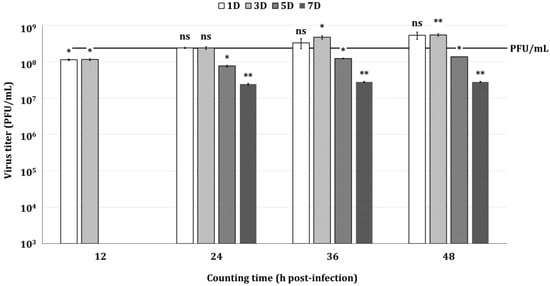 Figure 4. Virus quantification values by the direct titration method using the Sf9-QE cells. Sf9-QE cells were used on days one, three, five, and seven after subculturing. The virus, quantified as 2.39 × 108 PFU/mL (marked as line with PFU/mL) by the end-point dilution assay involving the TCID50, was diluted to 10−5 and inoculated into the Sf9-QE cells. The number of fluorescent Sf9-QE cells was measured at 12 h intervals for up to 48 h after virus infection. Statistical significance was determined using a t-test (p < 0.05); ns (not significant, p ≥ 0.05), * p < 0.05, and ** p < 0.01.