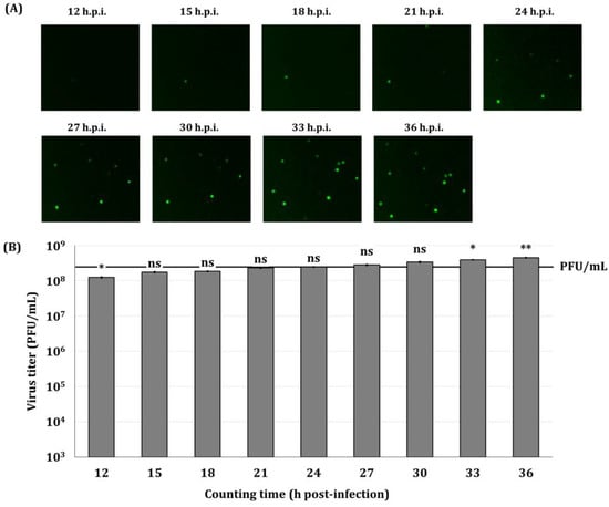 Figure 5. Fluorescence micrographs of Sf9-QE (A) with virus infection and virus quantification values (B) produced by the direct titration method. Sf9-QE cells at three days after subculturing were used. The virus, quantified as 2.39 × 108 PFU/mL (marked as line with PFU/mL) by the end-point dilution assay involving the TCID50, was diluted to 10−5 and inoculated into the Sf9-QE cells. Fluorescence observations and cell counting were performed at 3 h intervals from 12 to 36 h after virus infection. Statistical significance was determined using a t-test (p < 0.05); ns (not significant, p ≥ 0.05), * p < 0.05, and ** p < 0.01.
